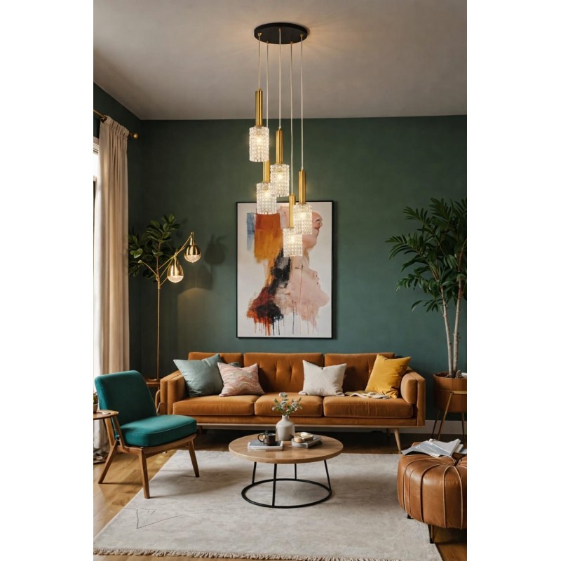Lustra moderna pentru interior, cu structura din metal vopsita in camp electrostatic negru mat cu elemente finisate de alama si abajururi din sticla suflata transparenta amprentata la cald.