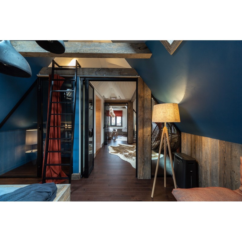 Lampadar cu baza din lemn si abajur din panza de culoare bej,inedit pentru locuinta dumneavoastra.