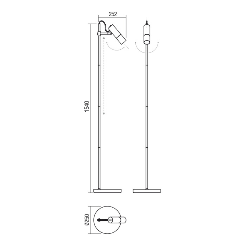 Lampadar orientabil pentru interior, structură și dispersor din metal vopsit negru mat cu detalii finisate alamă.