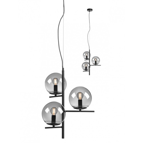 Suspensie pentru interior, structură din metal vopsită negru mat, dispersoare din sticlă suflată fumurie.