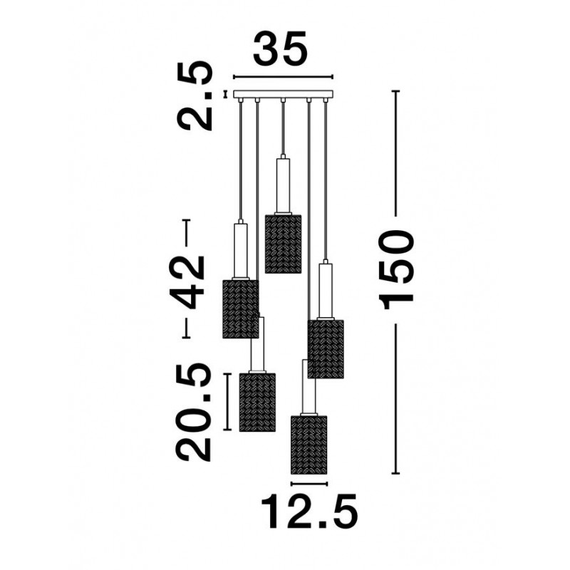 Lustra moderna pentru interior, cu structura din metal vopsita in camp electrostatic negru mat cu elemente finisate de alama si abajururi din sticla suflata transparenta amprentata la cald.