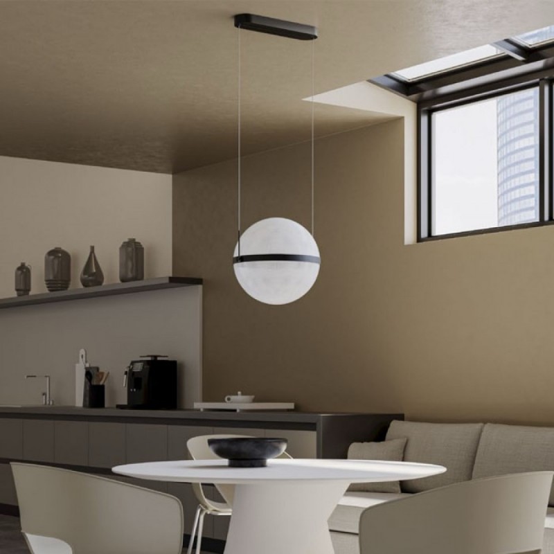 Suspensie moderna pentru interior, dimabila TRIAC, cu structură din aluminiu și metal vopsita negru mat si dispersor din acril transparent cu decor serigrafiat alb.Echipata cu LED-uri SMD 34W cu temperatura de culoare alb cald 3000K. Total flux luminos 1998 lumeni.