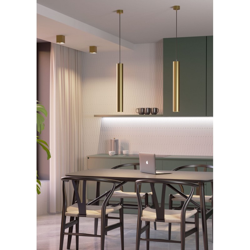 Suspensie pentru interior, structură din metal și aluminiu extrudat, finisaj auriu mat la exterior și negru mat la interior.