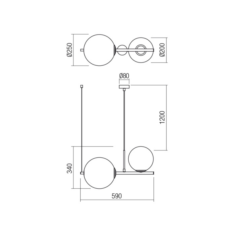 Suspensie pentru interior, structură din metal vopsită negru mat, dispersoare din sticlă suflată alb opal și cablu textil negru.